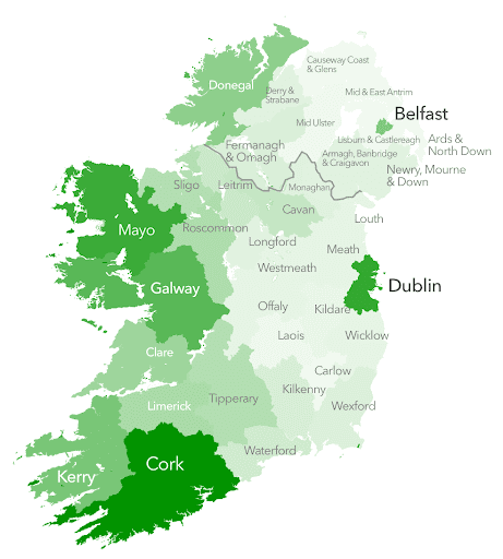 We learned that although Irish immigration peaked in the U.S. in the mid-19th century, many of the connections we found were much more recent. To more closely examine those connections, we looked at how many customers in the United States reported having Irish grandparents. Then we asked those customers where in Ireland their grandparents called home.